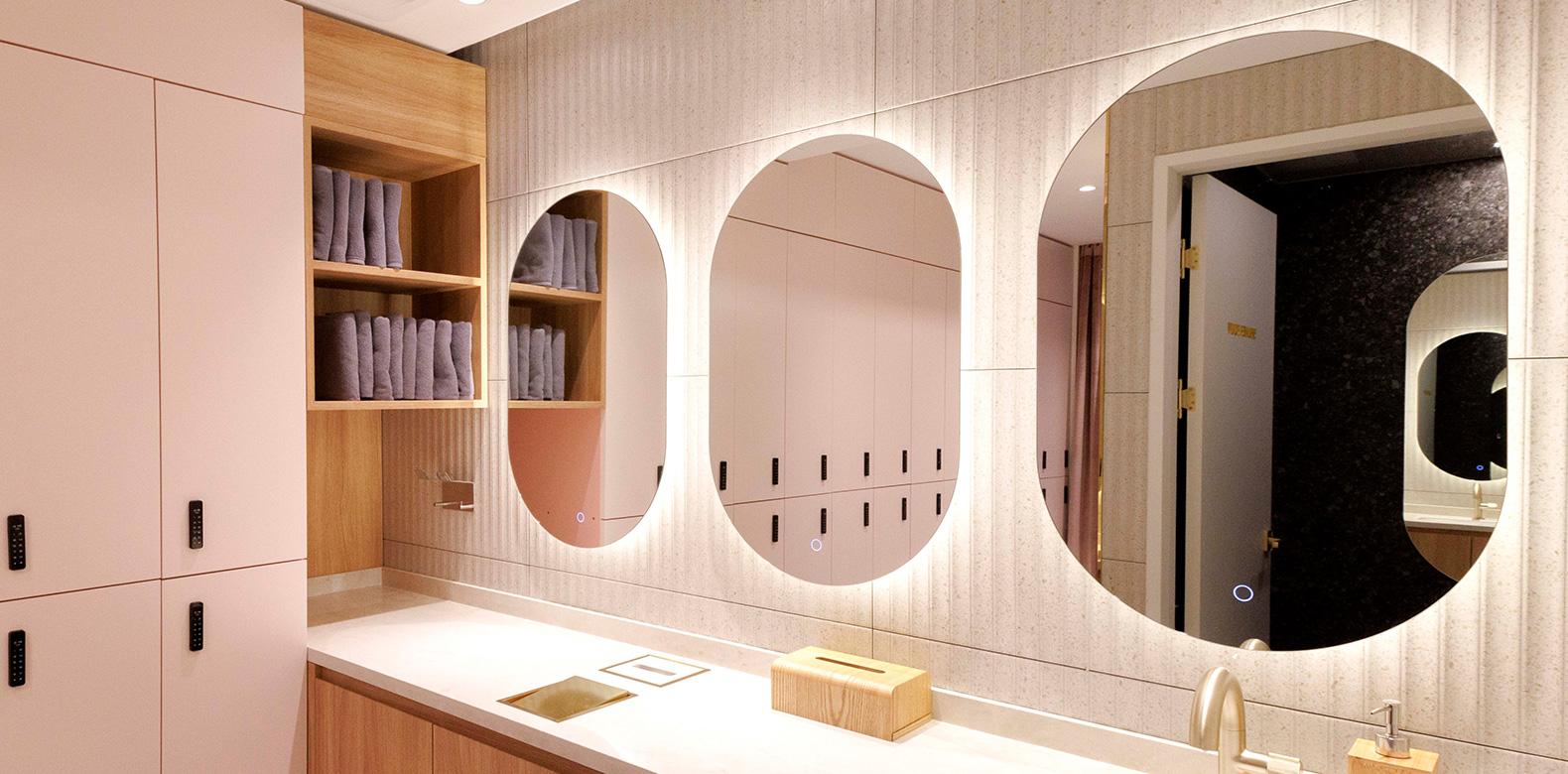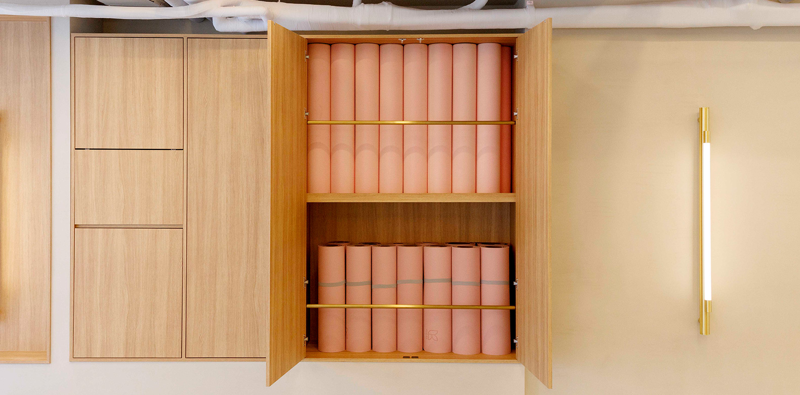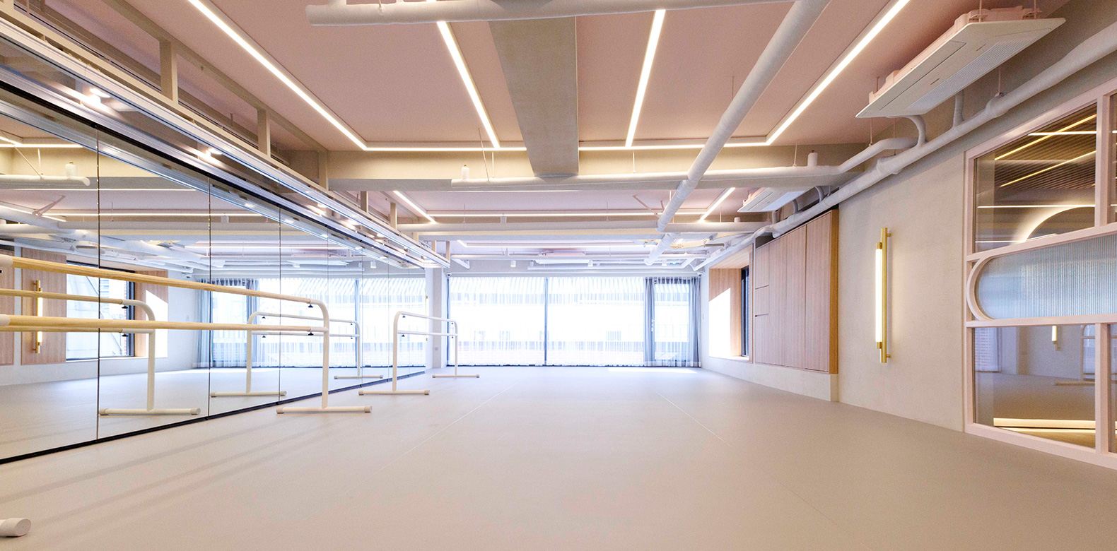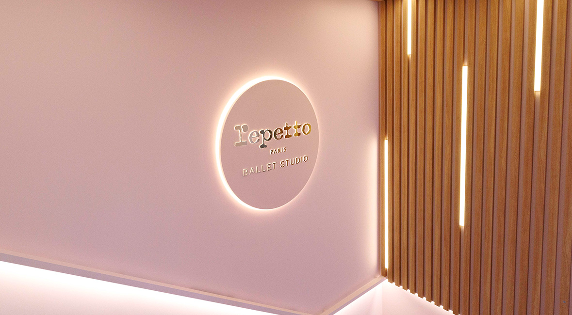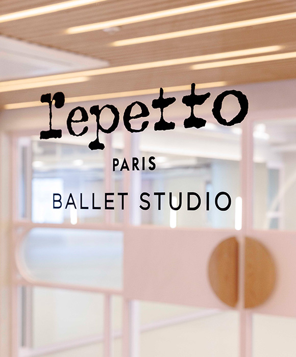 레페토 발레 스튜디오의 인테리어는 브랜드 시그니처 핑크 컬러에 따스한 우드 소재를 더해 모던한 분위기로 완성했다. 댄스 플로어는 최고급 발레 플로어 브랜드 제품을 사용해 안전하게 동작을 배울 수 있다. 또, 공간의 3면이 통창으로 설계되어 채광이 좋고, 층고를 최대한 높여 전체적으로 여유롭고 탁 트인 느낌을 자아낸다.